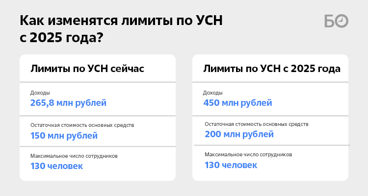 На момент написания этой статьи, лимит по доходам для применения УСН составляет 150 миллионов рублей в год. В случае превышения этого порога, предприниматель обязан перейти на другую систему налогообложения — общую или упрощённую с другим режимом. Также есть лимит по расходам, который составляет половину доходов, — при его превышении также необходимо пересматривать режим.